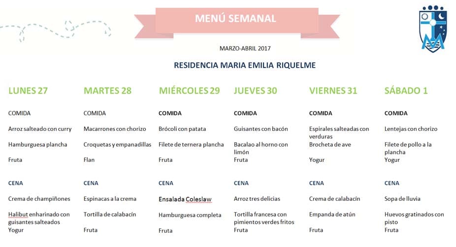 Menú del comedor de la residencia universitaria Riquelme de Pamplona. Recoge los días del 27 de marzo al 1 de abril.