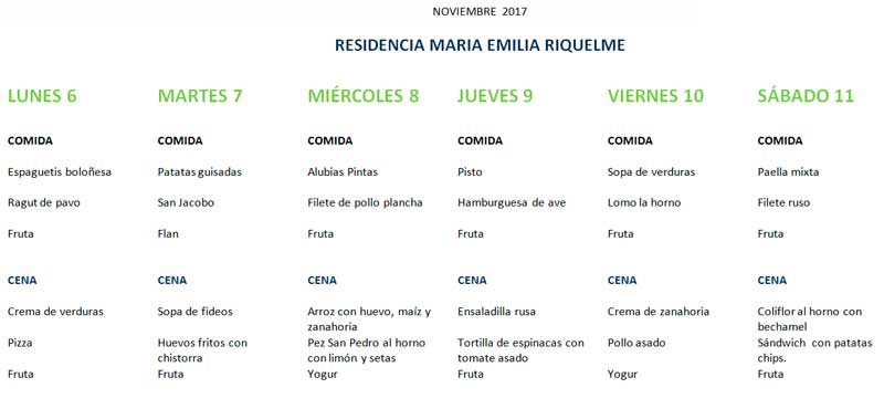 El variado menú del comedor, que recoge del día 6 al 11 de noviembre del 2017, de la Residencia universitaria Riquelme de Pamplona