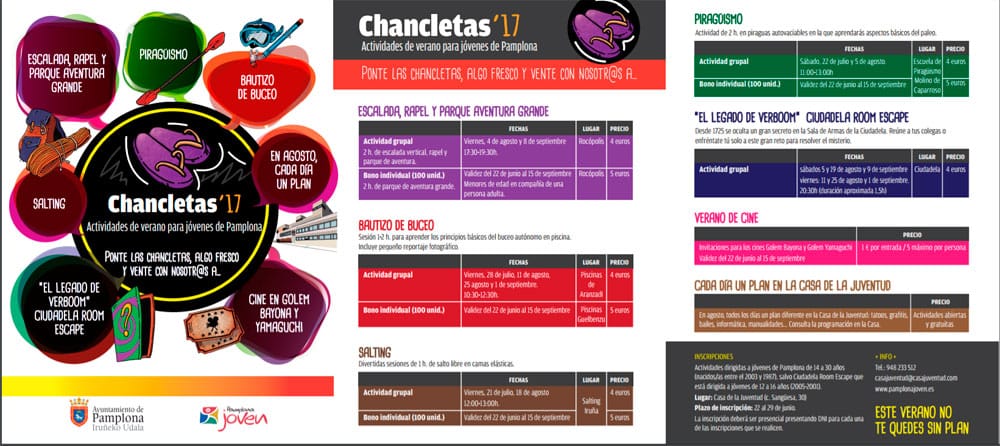 «Chancletas 17» es la nueva propuesta de actividades de verano para jóvenes de Pamplona que ha puesto en marcha el Ayuntamiento de la ciudad. ... Leer más