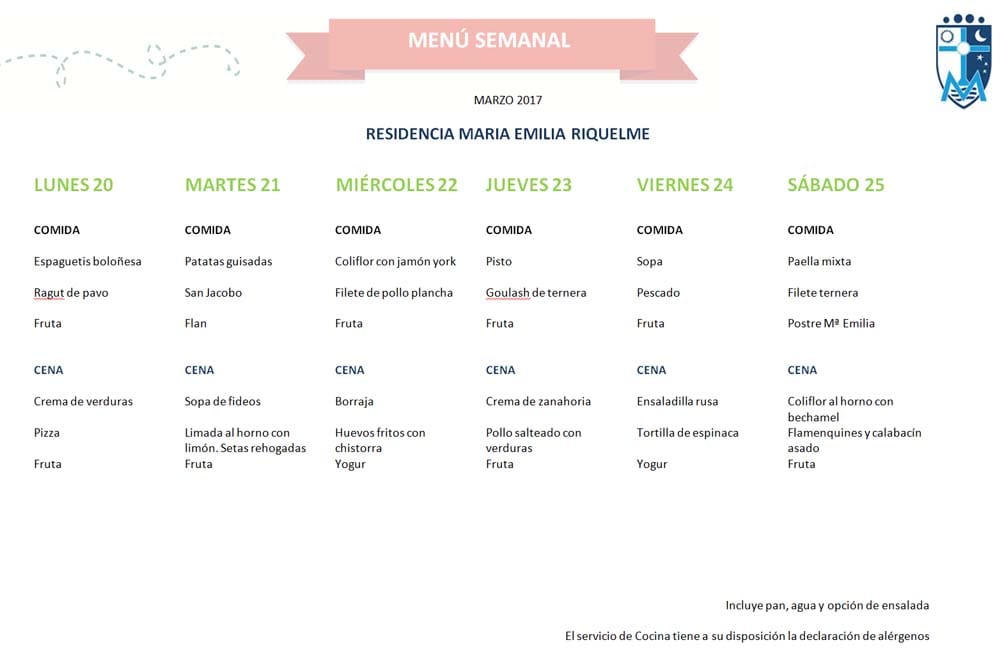 Menú del comedor de la residencia Riquelme de Pamplona. Recoge los días del 20 al 26 de marzo.