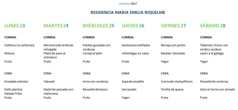 Os dejamos el esperado menú del comedor de la residencia Riquelme de Pamplona. Perteneciente a la semana del lunes 23 al sábado 28.